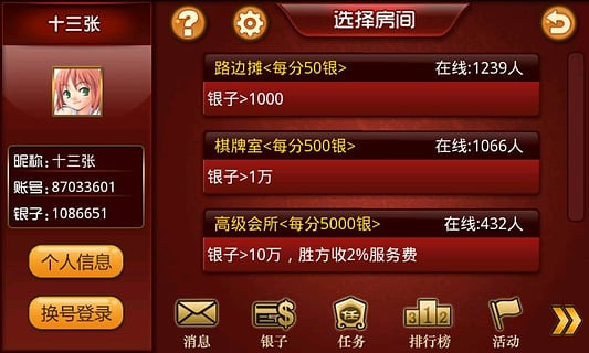 《集结号十三张 无限金豆破解版》是一款棋牌游戏,《集结号十三张 无限金豆破解版》中,玩家利用手中的十三张牌分三组进行跟其他玩家比大小,大的算赢,小的算输,玩家需要去合理安排三组牌的大小,不能大小牌都集中在一起。