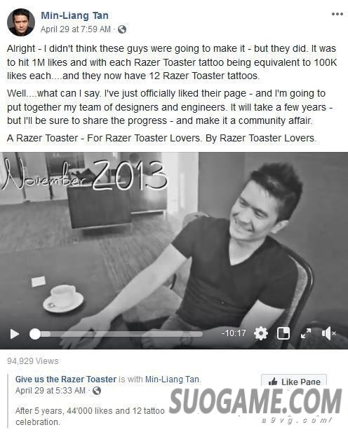 其实关于面包机的梗,最早并非源于2016年愚人节的玩笑,而是可以追溯到2013年陈民亮与粉丝间的口头赌注。当时陈民亮同意,只要雷蛇的粉丝们能在“我要雷蛇面包机”这个活动页面上集齐100万个赞(每个在身上纹了雷蛇面包机图案的人可以算10万个),就真的让面包机项目上马。现在光是纹身的人就已经超过12个了,看来早已达到了目标,因此陈民亮也不能食言。