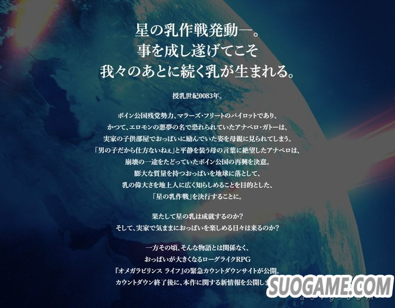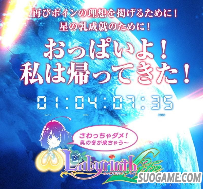 D3P预定于2019年内推出的Switch新作《欧米茄迷宫 人生》公开了一个倒计时页面,并将于北京时间1天后执行“星之乳作战”公开游戏的最新情报,配以标题“欧派呦!我回来了!”。下面文字介绍里什么授乳世纪0083年、大波公国残党、工口门的恶梦“阿纳佩罗·卡多”、将巨大的欧派坠落地球之类的……
