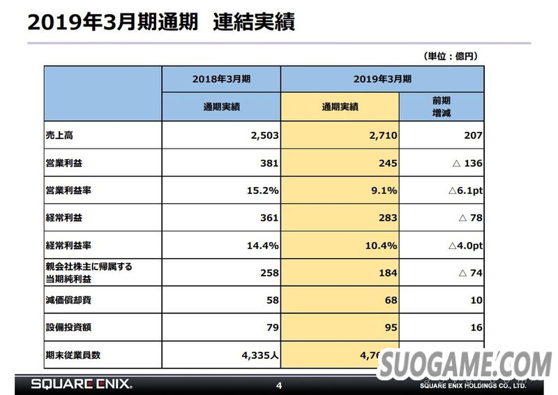 SQUARE ENIX公开了2018-2019财年的年度财报。该财年SE的营业额为2710.48亿日元同比增长8.2%,营业利益为245.31亿日元同比下降35.7%。