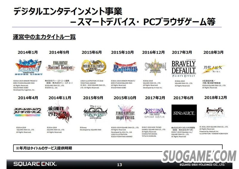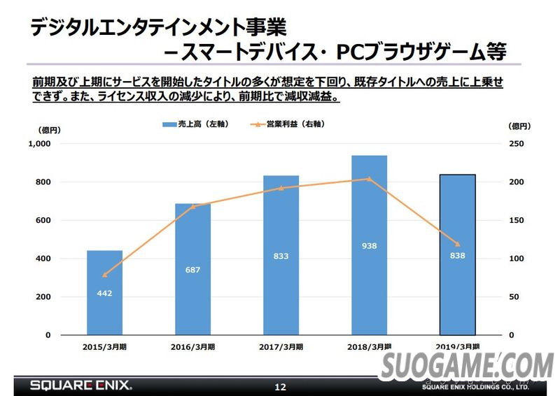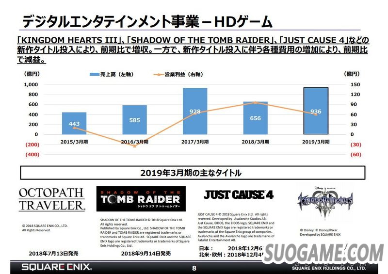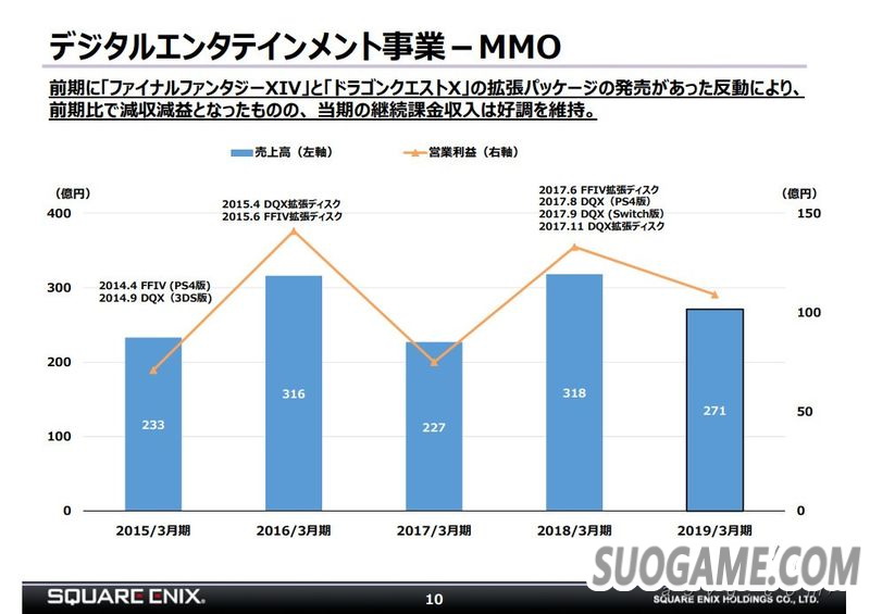 网络游戏方面,因为上一年《最终幻想14》和《勇者斗恶龙10》都推出了大型新版本而这一年并没有,所以相比之下也减收减益。不过持续性收入还是比较稳定。