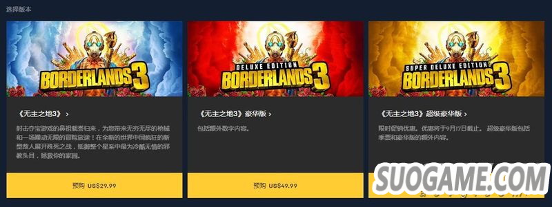 · 《无主之地3》国区预购——标准版29.99美元、豪华版49.99美元、超级豪华版69.99美元