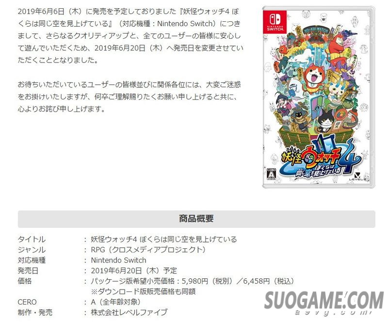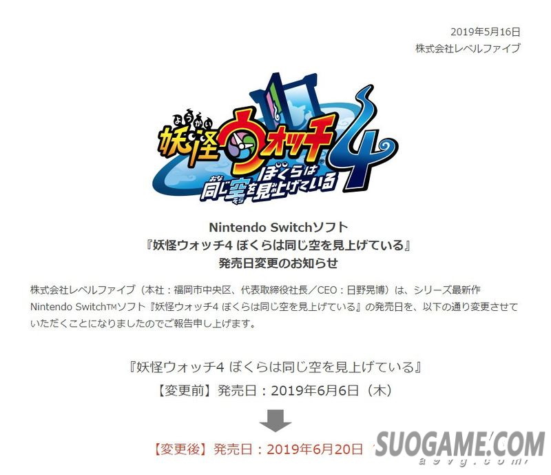 Level-5宣布原定于2019年6月6日发售的Switch新作《妖怪手表4 我们仰望同一片天空》将延期到6月20日发售,理由是为了提升游戏的品质,能让全部的玩家们都能安心地游玩。