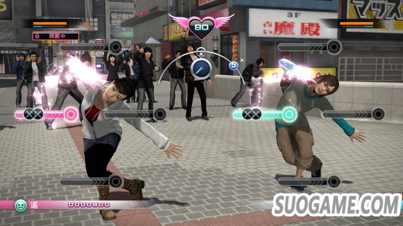 收录嘻哈、浩室、偶像、爵士、摇滚五种乐曲的热舞对战,会在角色上下左右的位置各有一个长条框,要配合时机按下出现在长条框的按钮。若是能够连段,遥就能展现华丽的动作。
