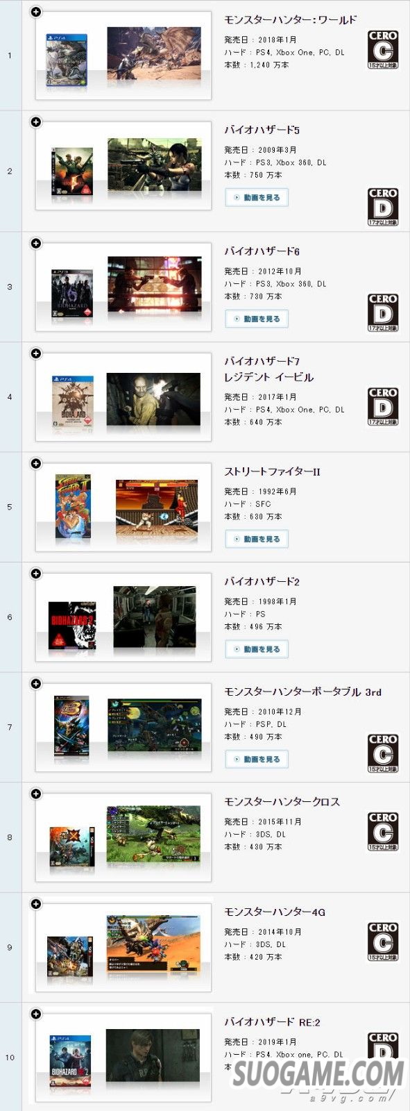 CAPCOM更新了旗下百万以上游戏销量数据(截至19年3月31日),主要的更新内容有: