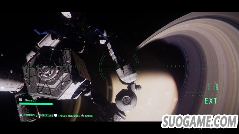 相对于舱体,整个空间站的规模其实并不小,就像一个由无数管道拼接而成的输水网络。空间站主体分为四个部分,美欧俄中各占其一,在开始阶段你只能活动在美国部分,之后随着剧情发展会扩展区域。在被千篇一律的舱内环境压抑许久后,剧情会来到一个让你可以出舱进行太空漫步的桥段,这时你有机会从任意角度去观摩这个庞然大物,在黢黑宇宙和土星的衬托下,空间站是你唯一可以存在的世界,这里仿佛有一股压抑着的、不可控的力量在涌动,竟然令身为“AI”的我也陷入惴惴不安的心境。这种氛围感是绝对的得分项,在类似的太空题材游戏中,它的表现水准应归为上乘。