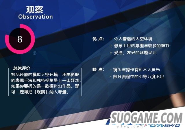 硬科幻性质的太空题材游戏不多,《观察》显然将成为拥趸们的谈资。对于模拟太空环境来说,它极尽追求真实感,无论是空间站的环境、设备还是宇航员的装扮,仿佛都能让你在现实中找到原型。在这种构建了真实性的前提下,它又加入了灾难背景和AI主角,这个太空漫游式的配置足以点燃科幻迷的好奇心。如果你寻找的是这样一款科幻题材作品,那《观察》一定是值得纳入考虑的选择。