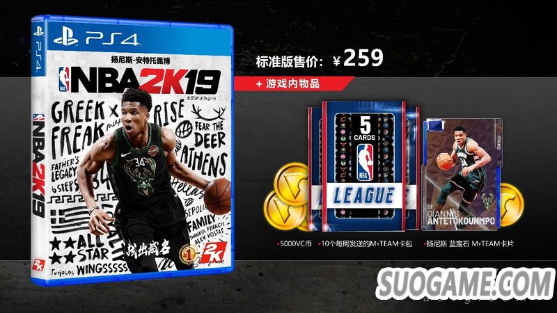 《NBA 2K19》国行标准版售价259元,内含VC等虚拟道具。