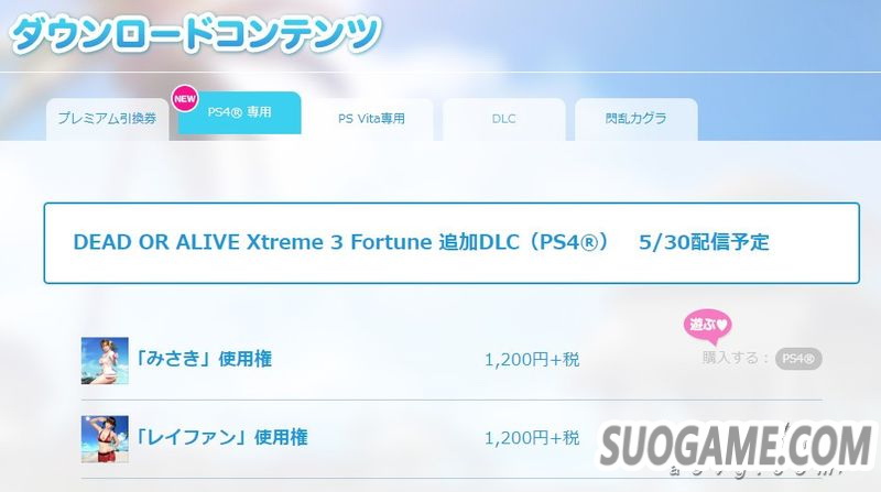 光荣特库摩宣布PS4版《死或生沙滩排球3 幸运》将于北京时间5月30日推出海咲和丽凤两名追加角色的DLC,价格各1200日元+税,这样购买DLC之后“幸运”也可以拥有与“绯红”同等的游戏内容,甚至还拥有三个“绯红”中被砍掉的道具“漆黑的扇子/金色扇子/柔嫩护肤用品“。