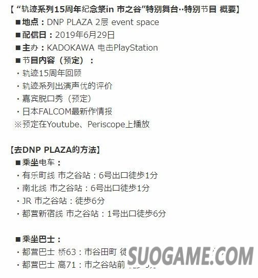 日本Falcom将于北京时间6月14日-7月7日在日本举办“轨迹系列15周年纪念祭in 市之谷”,其中包含各种展示内容和周边销售等。而在6月29日(周六)的特别舞台上还会介绍包含Falcom最新作情报在内的各种内容,出演嘉宾则有近藤季洋社长和托瓦的声优野中蓝等人。