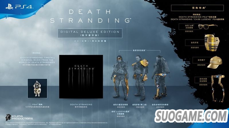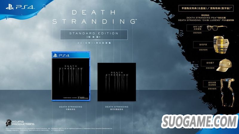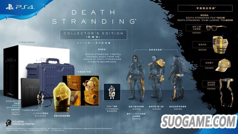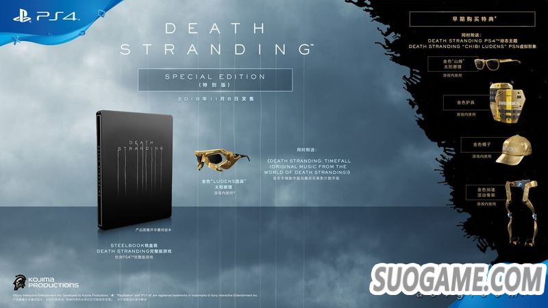 本作确定同步推出简体中文版,购买首批实体/数字版将附送《死亡搁浅》的PS4主题、小智人的PSN虚拟形象、游戏内道具金色“山姆”太阳眼镜、金色护具、金色帽子以及金色加速活动骨架(以上特典将对应所有版本)。