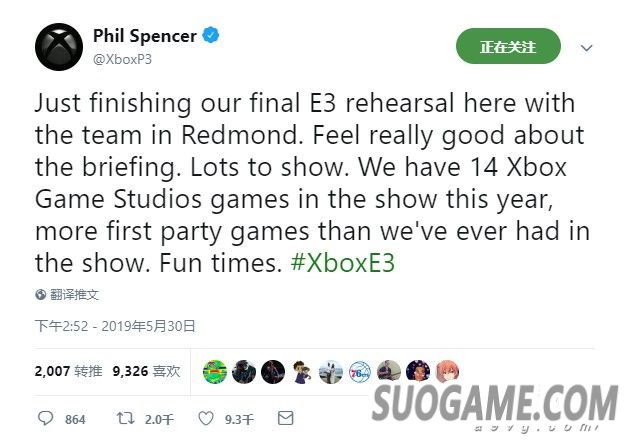 微软Xbox负责人菲尔·斯宾塞今天发文确认,会有14款来自Xbox Game Studios的作品在E3 2019上进行展示,这也是微软有史以来第一方作品最多的一次E3。微软的展前发布会将于北京时间6月10日凌晨4点举行。