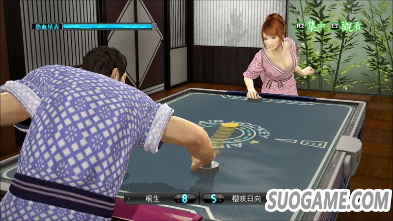 首先介绍在人中之龙5新收录的游戏吧。系列中首次出现且适合约会游玩的招牌游戏「桌上曲棍球台」,设置在温泉设施裡,可穿着浴衣游玩。