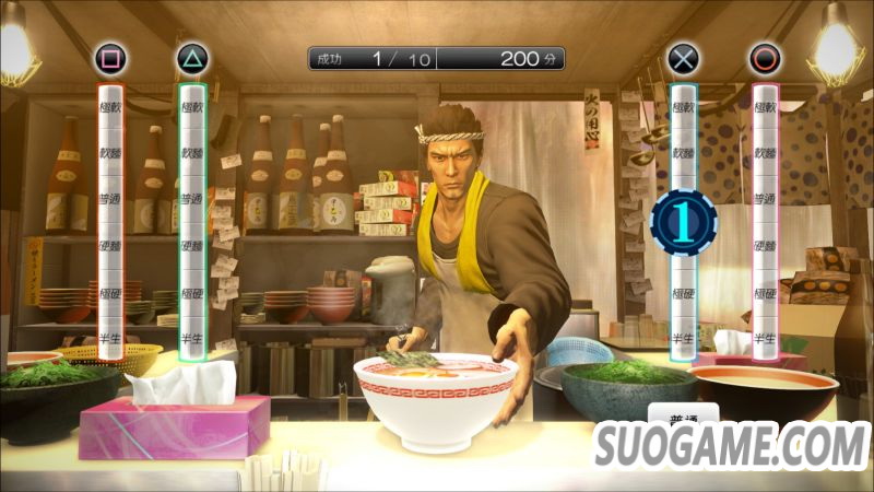 代替闪到腰的拉面摊老板,穿起围裙挑战煮拉面的小游戏。配合时机在量表延伸到客人想要的硬度时按下按钮,好好甩动拉面吧。