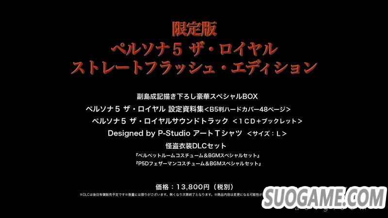本作将于北京时间10月31日发售日版,中文版2020年推出。在这次的视频中还公布了游戏限定版的情报,限定版将包含豪华包装盒、设定资料集(B5开、48页)、原声CD(1张盘+小册子)、P-Studio设计的艺术T恤(尺码L)、怪盗服装DLC套装(天鹅绒房间服装与BGM、P5D舞者服装与BGM),价格13800日元+税。