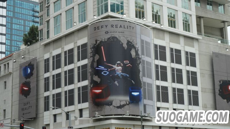 菲格罗亚酒店右侧马路对面的广告是Oculus Quest一体式虚拟现实游戏系统以及《节奏光剑》。