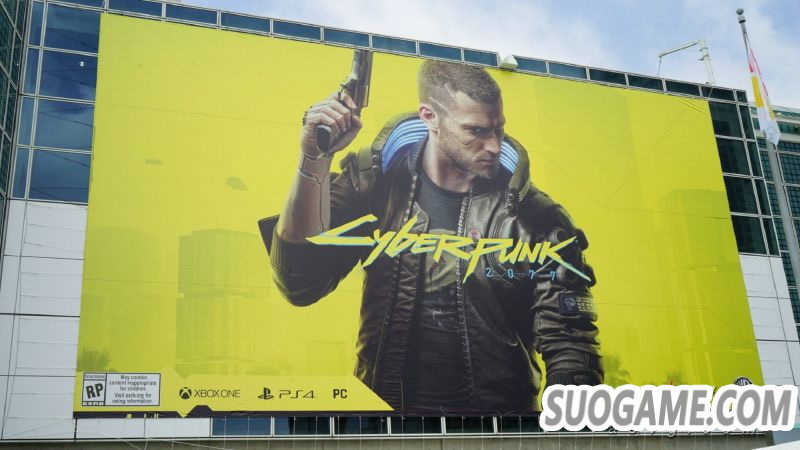 在南馆入口右侧外墙上,也就是连接南馆和西馆的长廊外,目前唯一悬挂的广告是《赛博朋克2077》。这个广告位前几年也属于华纳,而CDPR今年会在华纳的展位中出展。这则《赛博朋克2077》的广告图也和今日泄露的游戏实体版封面相同,想必CDPR会在今年E3中公开特别多关于本作的新消息。
