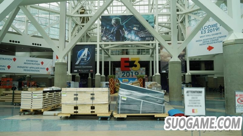 我们从洛杉矶会展中心南馆入口进入了E3会场的外围区域,悬挂在头顶的几幅广告依然属于史克威尔艾尼克斯,它们从左至右依次是《复仇者联盟》《最终幻想7 重制版》《最终幻想14 漆黑的反逆者》,并且广告之中还写了这些游戏在E3之中的展出位置。