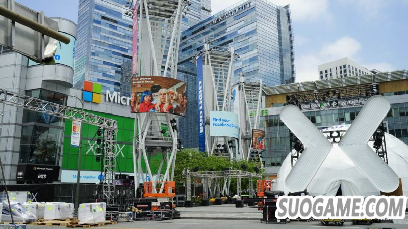 在微软剧院前的Xbox广场上正在搭建的是Mixer直播平台展示区,这里有两个巨大的圆球形建筑,届时玩家可以进入其中。