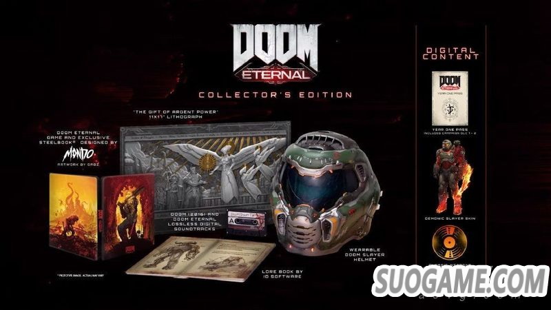 本作除了普通版游戏外还将发售豪华版和收藏版。豪华版包含一张电子年票,可兑换两个DLC包、恶魔皮肤以及经典武器音效包;收藏版内容包括毁灭战士头盔、设定集、海报、原声带等(如图)。