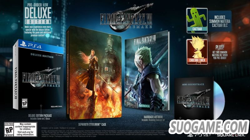 豪华版包含萨菲罗斯封面的铁盒、画册、迷你OST、“陆行鸟召唤魔石”以及“仙人掌召唤魔石”。