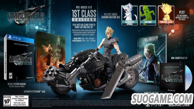 “一级特种战士”限定版包含萨菲罗斯封面的铁盒、画册、迷你OST、“陆行鸟召唤魔石”、“仙人掌召唤魔石”、“红宝石兽召唤魔石”以及克劳德可动手办。