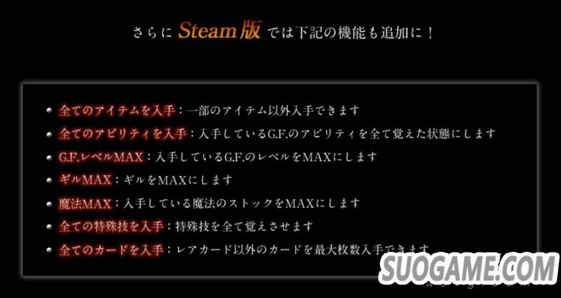 此外PC(Steam)版将会拥有额外的金手指要素,详情如下: