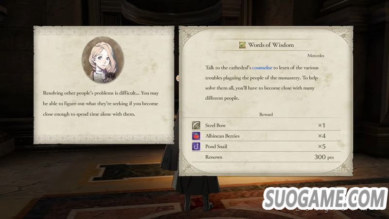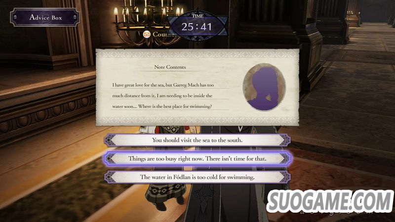 · 大教堂有一个建议箱,每个月会收到咨询烦恼的信件。需要在限制时间内通过选项回信,另外发信人会用剪影隐藏相貌,回信完后会公开相貌,如果选对的话将增加该角色的好感度。这个行动不需要消耗行动点数。