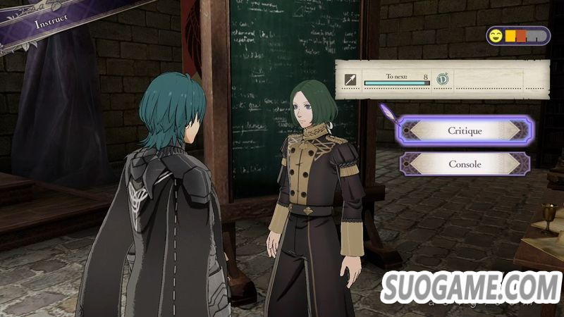 指导其实就是选择一名学生提升其武器熟练度,每名学生可以指导两次。指导时将有几率失败,失败时会降低心情,这时可以选择批评或安慰,要根据角色性格来选择,有的学生喜欢被安慰有的则喜欢批评(抖M)。另外失败不会扣除指导次数,也就是说在两次用完之前即使失败也可以继续指导,直到心情被降低到最低点。