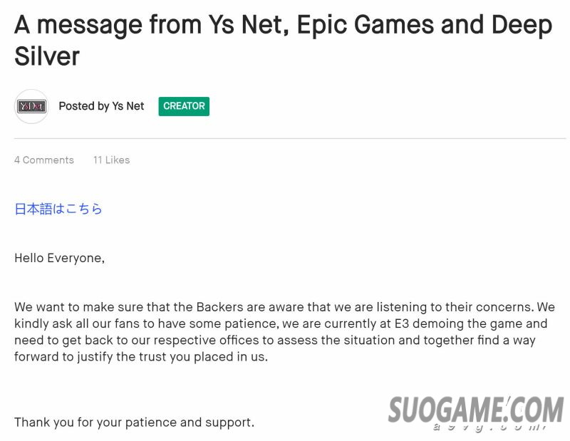 Ys NET、Epic Games、Deep Silver三家关于《莎木3》发表联合通知:我们已经听到众筹者们的声音,现在我们正在E3展示游戏,等我们各自返回公司后会根据现在的情况一起寻找挽回大家信任的方法,请大家再耐心等待一下。