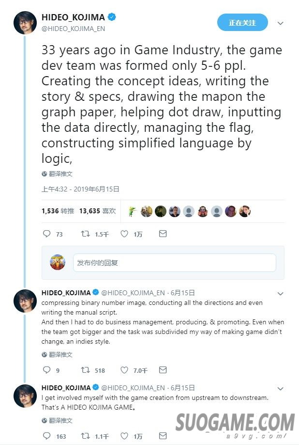 近日小岛秀夫在推特上解释了为什么他的作品会有强烈的个人烙印。小岛表示在33年以前游戏的开发团队往往只有5、6个人,大家要肩负从概念设计、剧本编写到数据录入、脚本编撰的所有工作。此外小岛秀夫本人还会负责游戏的商务管理、制作和推广。当团队规模扩大、分工更加细化之后,小岛的工作也没有发生变化。正是因为他亲自参与游戏从上到下的各个环节,所以这些作品才能被称为“A HIDEO KOJIMA GAME”。