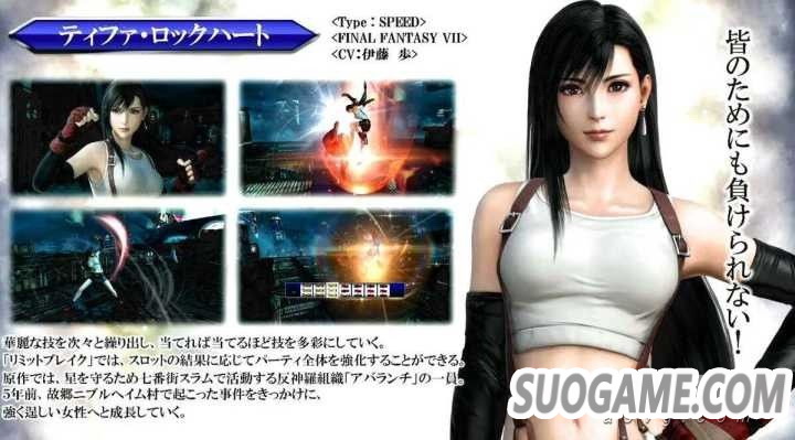 蒂法最初登场于《最终幻想纷争012》中,在本作中的定位是速度型角色,使用特有技能“极限技”将还原原作中的老虎机效果,根据转出的样式可以对小队全员进行强化,并且保留了来自012中可以取消部分攻击动作的特性。