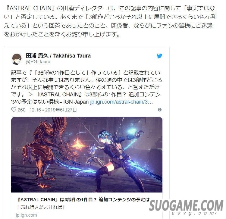 6月27日更新:田浦贵久出面澄清表示IGN曲解了他的意思,他只是脑内幻想过本作的剧情可以做三部以上,并不是真的要这么做。