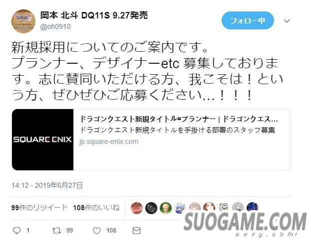 在此前的《勇者斗恶龙Walk》发布会上,开场致辞时DQ系列的执行制作人三宅有曾透露堀井雄二已经开始着手准备DQ12的制作了。并且从冈本北斗(DQ11制作人)与内川毅(DQ11监督)这个阵容来看,本作特别有可能是一款正统续作。值得一提的是,上一次开设这样的专页时,正是《勇者斗恶龙11》的制作人齐藤阳介为DQ11招募开发成员的时候。