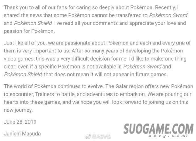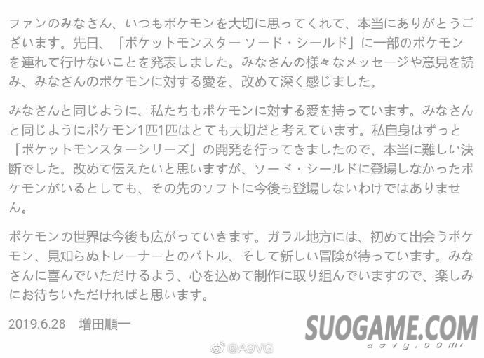 和大家一样,我们也深爱着宝可梦,也和大家一样关心着每一只宝可梦。我自己一直在制作《宝可梦》系列游戏,这真的是一个非常艰难的决定。我想再次告诉大家,虽然有些宝可梦没有在《宝可梦 剑/盾》中登场,但并不表示它们不会出现在今后的游戏当中。