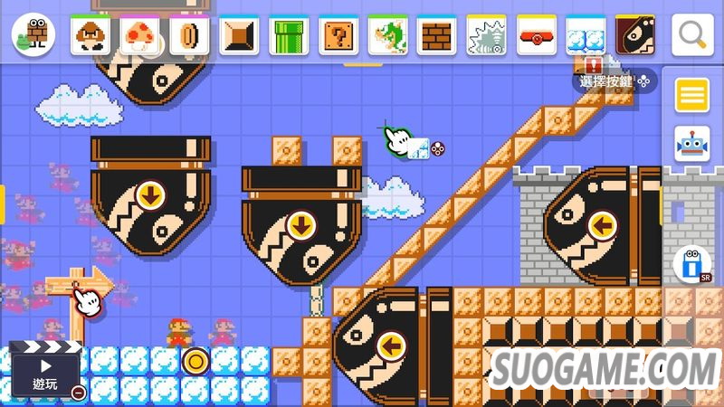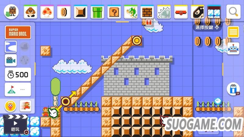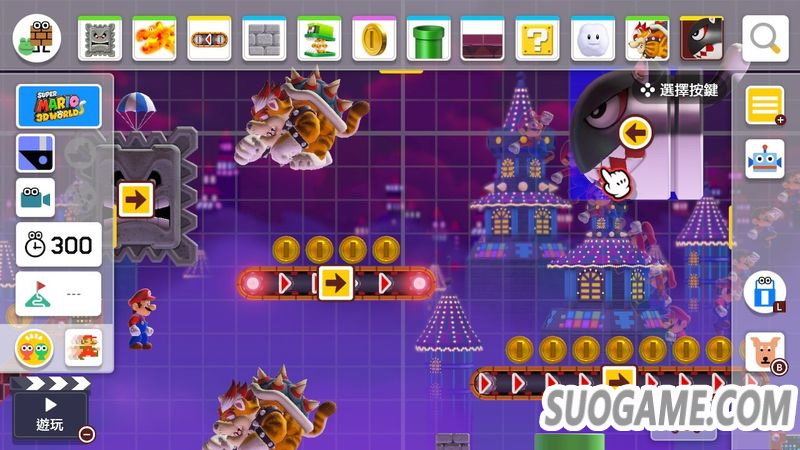 本作建造的方式和前作并没有太大的区别,但在可使用的选项上却得到了极大的拓展,在创作界面游戏会以浅显易懂的方式将可供玩家选择的道具、障碍、敌人等内容展现在玩家眼前,同时界面中也有部分隐藏的设定例如通过按键改变敌人的类型,为板栗仔插上翅膀等,不同的移动平台也会有不同的行动轨迹,这些轨迹也是需要玩家自行设定,不过需要注意的是这些场景和风格皆是跟随玩家所选择的马力欧风格进行变化。