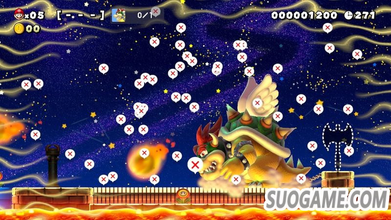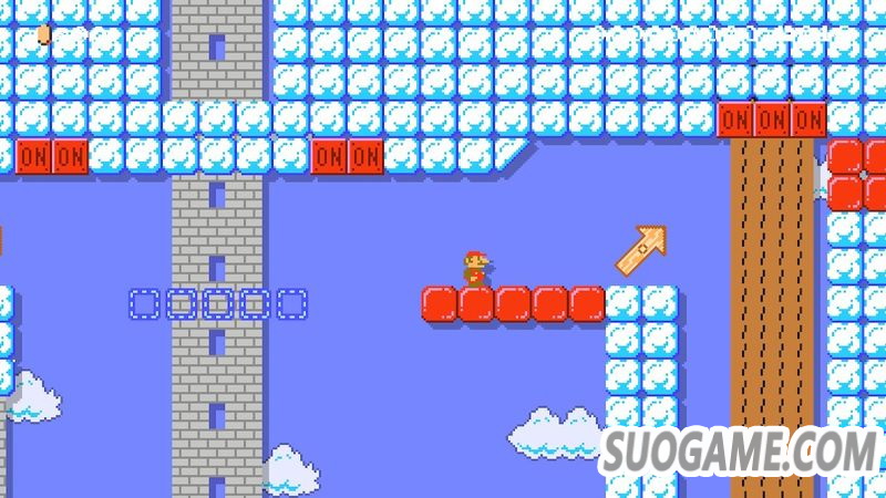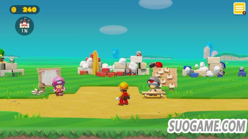 故事模式是此次加入的全新内容,在剧情的设计上也并没有太多复杂难懂的点,重启狗误触了重置按钮导致恢宏的桃子城堡成为了废墟,而玩家索要做的就是通过完成一个个关卡收集足够的金币来重建桃子城堡。在流程的概念上此次故事模式更像是一种特别的教学,游戏中不同的关卡皆是以“委托”的形式出现,随着流程的推进越来越多可以在游戏中所实现的关卡构筑方式会在玩家面前一一呈现出来,而当玩家自以为掌握了游戏的概念时又会有新的设计给玩家当头一棒,随着流程不断地推进,游戏也会逐渐为玩家展示出来在关卡设计中多样的可能性,这也让后续自己在制作关卡的过程中可以获得更多的灵感。而又不同于“马力欧”系列的常规形式,在本作中关卡的呈现方式都是独立存在,而并非常规以“X-X”的形式展现,尽管彼此独立但每一个关卡都可谓各具特色,不同的关卡几乎涵盖了马力欧系列每作中各式经典的元素,这不仅局限于我们熟悉的平台跳跃,飞行、汽车等等形式都有所提及,这也让每一个新的关卡都可以带来一种“前所未有”的味道。
