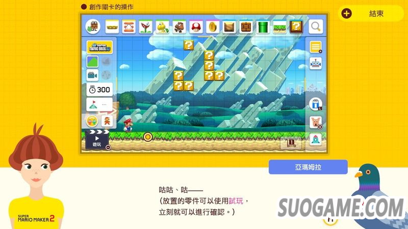 为了减少玩家在创作时陷入误区,在创作模式下游戏还提供了“亚玛姆拉道馆”这一额外功能,这也正是前文所提及的辅助功能之一,在该功能下游戏会以NPC的角度告诉玩家一些有关于对于轨迹的测量、一些问题的解决办法、如何针对关卡进行测试等功能的提示,只不过在目前《超级马力欧创作家2》的大环境下一些NPC的友情提示往往在体验其他玩家制作的关卡时反其道而行会有意想不到的效果,例如“一定要提醒玩家前边有个大坑”...“道馆”的设计可以为关卡的创作带来十分重要的灵感,在进入死胡同时游戏往往可以为玩家指明一些比较有趣的道路以及如何更加有效地保持游戏的整体节奏,就目前的“关卡编辑器作品”来说《超级马力欧创作家2》应该是屈指可数的优秀作品之一了。