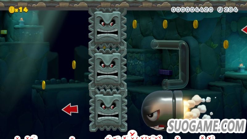 本作在内容上对前作进行了不少细节内容上的增强,在前作中比较遗憾未能登场的“斜坡”等设定,在本作中一并得到了回归,这也让玩家在创作关卡的过程中可以更加灵活地发挥创意,同时也可以让自己关卡的恶意程度再度得到提高,一个急速下坡过程中空中安置几个诱惑力极大的金币,在落点处放置一个深坑,这样的“害人手段”在设计的过程中可谓屡试不爽,甚至在游玩过大量玩家创作的关卡后看到金币都要斟酌一下这到底是不是陷阱。此外在本作中还加入了白天黑夜区分的系统,在游戏中通过与新道具月亮的联动,同样的关卡中会产生特别多不同的变化,例如沙漠会挂起沙尘、沼泽的水位会上升等,甚至连蘑菇等一些常见道具在夜幕降临时都会发生不同的变化,整体十分有趣。