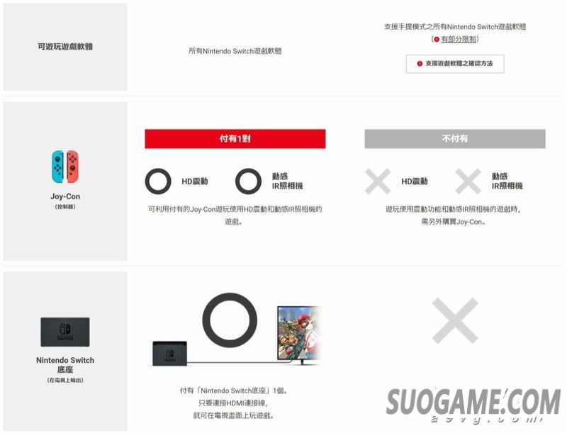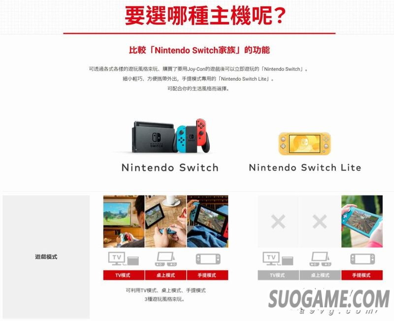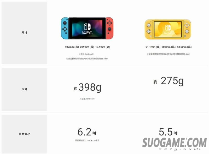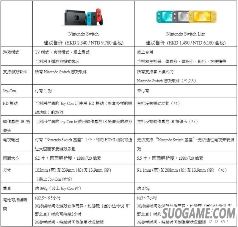 关于“Nintendo Switch”和“Nintendo Switch Lite”之比较,请参考下列内容。