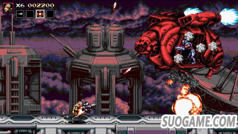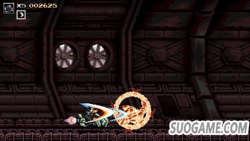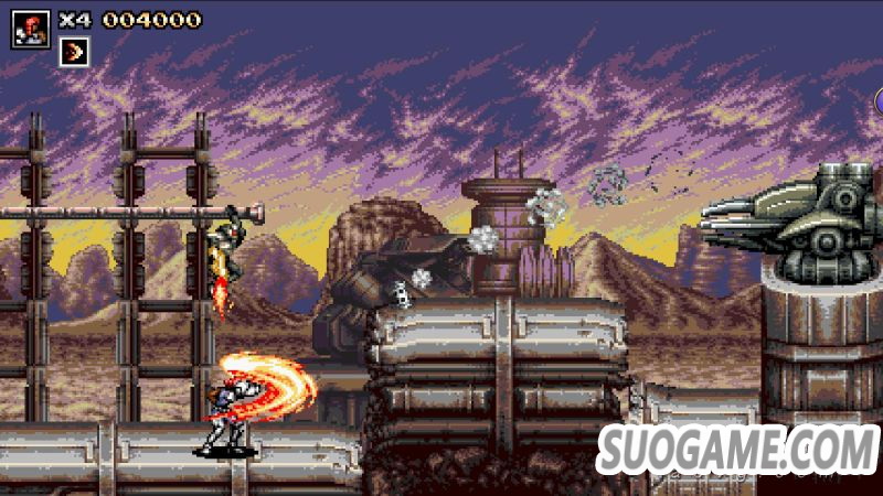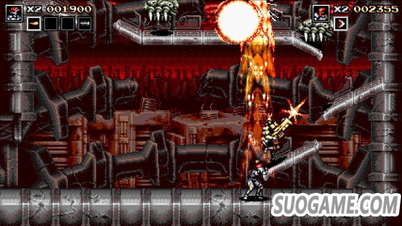 除了传统的跳跃射击外,游戏中还包含了多样的其他攻击方式,在本作中每一名角色都拥有近战动作,当敌人靠近主角到一定距离后,射击按键就会转化为近战攻击,在面对一些传统敌人包括部分Boss时,近战都会展现出比射击还要高额的伤害,不过因为主角被设定为一击死的状态,因此玩家并不能像《合金弹头》等作品中那样主动贴近敌人进行攻击,想要合理地通过近战击倒敌人,就需要玩家在移动过程中通过跳跃和移动等方式有效地和敌人保持距离,在一些敌人杂乱的环节还挺考验技术的。