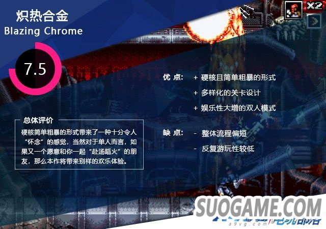不管是存留在记忆中儿时的 FC 时期还是大街小巷里各种街机厅中,你总能看到有一些个人围坐成群,一起扎堆在一个显示器面前,嘴里不时喊出一些稍有攻击性的语句,但在这些话语间却并没有那么火药味十足,这便是这种横板卷轴动作游戏所带来的一种特有魅力。而今天要介绍的这部《炽热合金》便是这样一款可以让玩家彼此再度体验在炮火中并进并在“尔虞我诈”中共同战斗乐趣的作品,硬派的游戏风格,射击、爆炸的战斗场面在这部作品中再次组成了一道十分有趣的方程式,本文也将针对这部作品的内容进行简单的游戏评测。