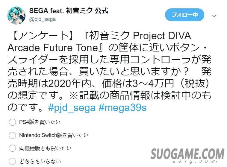 SEGA的《初音》系列游戏官推正在做一项调查。假如推出一款《初音未来 歌姬计划FT街机版》那样的按键布局并且带滑动条的控制器,预定在2020年发售,价格3-4万日元(约1900-2500元人民币)的话,你会买吗?