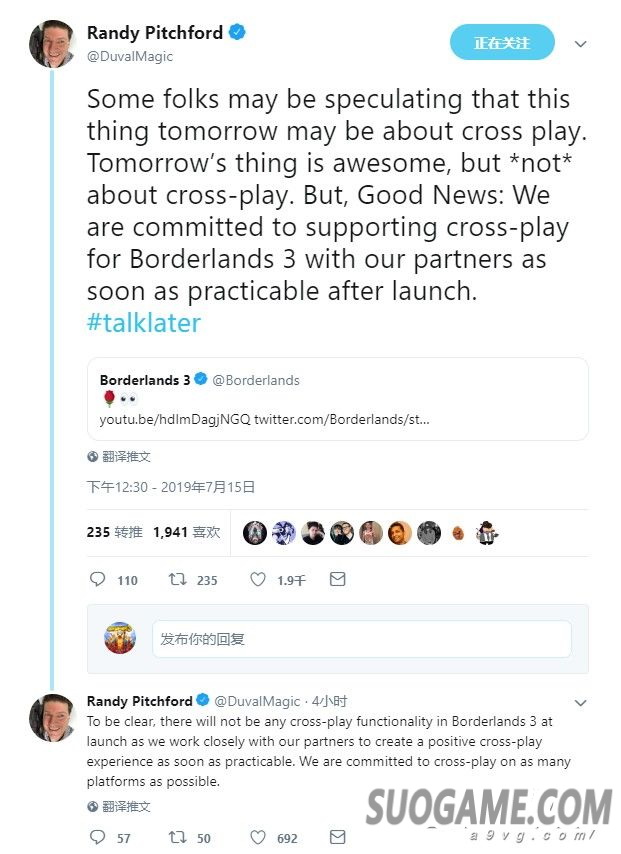Gearbox的CEO Randy Pitchford今天早些时候在社交媒体上确认,《无主之地3》在发售时将不具备跨平台联机的功能,不过他承诺会在游戏推出后尽快实现跨平台联机,并将努力覆盖尽可能多的平台。