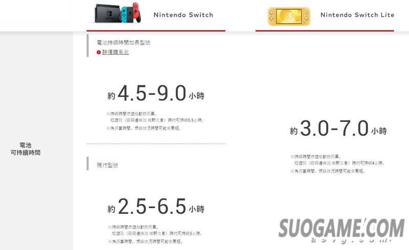 任天堂宣布将推出电池持续时间升级版的Nintendo Switch机器 ,续航时间提升到约4.5-9.0小时,游玩《塞尔达传说 旷野之息》约能持续5.5小时(原版续航约2.5-6.5小时,游玩旷野之息约持续3小时;Nintendo Switch Lite续航时间约3-7小时,游玩旷野之息持续约4小时),电池升级版的外观和原版一样保持不变。
