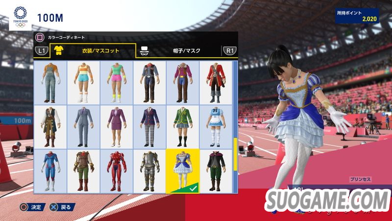 在「服装」项目中可以自定义虚拟人物的衣服与帽子/面具。除了体育服之外,还可以选择制服、西装、盔甲、洋装、太空服等各式各样的服装。使用在竞技中获得的分数,就可以解锁衣服与帽子/面具,最多可从超过100种的服装之中来进行选择。