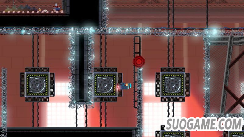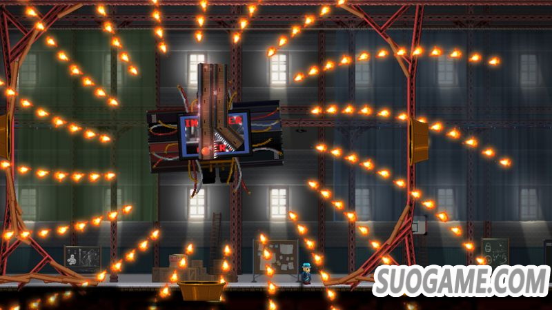 平台跳跃算得上是本作的灵魂所在了,可能在游戏开始前的教学时你特别难想到自己将要面对的是什么,而当你真正反应过来时,你已经身处于层层陷阱之中,在游戏中身处不同的章节中玩家将会遭遇多样且截然不同的关卡设计,这些关卡算得上极具创意,并且每个不同的关卡都会出现截然不同的机关,随时都会有不同的惊喜,随着剧情的深入,主角会逐步解锁更多的装备来武装自己,这也让谜题更加多样起来,整体而言比较有意思的就是一开始所获得的“攀岩鞋”,在获得这双鞋的那一开一扇神奇且疯狂的大门就算是正式打开了,鞋子的设定十分有意思,当径直走到一些高墙面前时你可以直接地无视重力走上去,当头顶出现了一些平台后,你可以通过跳跃直接倒立吸附在上边,这样的设计所带来的结果就是后续的关卡突然变换了一个画风,让游戏的类型在单纯的平台跳跃基础上加入了对于空间的概念,甚至当你以一种头朝下的姿势跳向空中还会出现特别的飞出宇宙的桥段,而这样的形式也将一直伴随到游戏结束,如果你觉得你当前所体验的关卡设计的特别精妙了,那么后续永远有一些更加打破想象的关卡在等着你。而在后续玩家还会逐步解锁更多样化的装备,可以说越往后操作上约会让人感到手忙脚乱的。可能制作组也知道对于并不是特别精通这类游戏的玩家可能这样的关卡会有些困难,当在同一个地方类似死亡一定数量后,在复活点游戏会为玩家提供额外一次的机会,随着死亡数量的提升额外机会的数量也会随之增加,这大大提高了过关的便捷性,也算是制作组的一点仁慈吧,而且有的关卡再有了额外机会的辅助下甚至可以一路淌着火走到关卡最后。