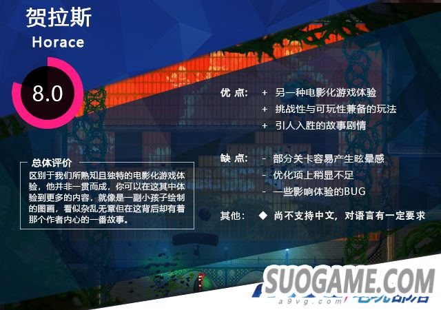 极具代入感的故事配合有趣的玩法,为这款看似朴实的游戏带来了无穷的活力,一些毫无关联的设定在本作中却达到了特别大程度的契合,通过一些简单的串联它带来了一种区别于我们所熟知且独特的电影化游戏体验,他并非一贯而成你可以在这其中体验到更多的内容,就像是一副小孩子绘制的图画,看似杂乱无章但在这背后却有着那个作者内心的一番故事,对于喜欢电影化情节游戏作品的玩家而言,这部《贺拉斯(Horace)》值得你尝试一番。