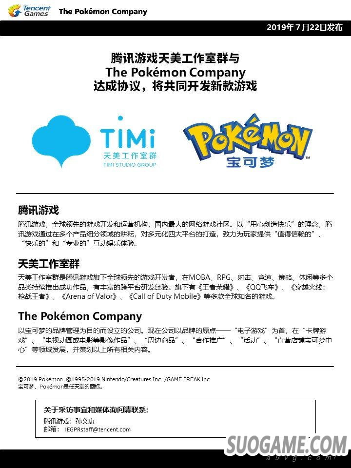 腾讯游戏官方今日宣布,旗下天美工作室群(TiMi Studio Group)与宝可梦公司(The Pokémon Company)达成协议,将共同开发新款游戏作品,相关游戏项目细节目前尚未公开。