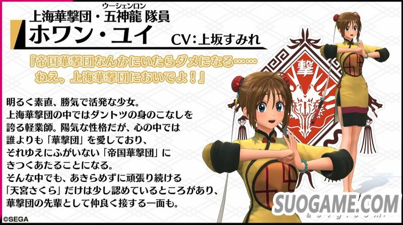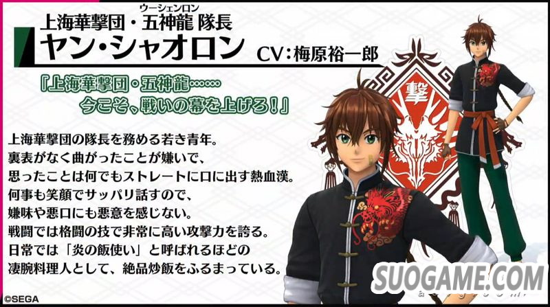 除花组成员外,之前提到过的上海华击团“五神龙”在本次直播中也终于登场,目前公开两名新角色,队长杨小龙(CV:梅原裕一郎)和队员黄郁(CV:上坂堇),人设由堀口悠纪子负责: